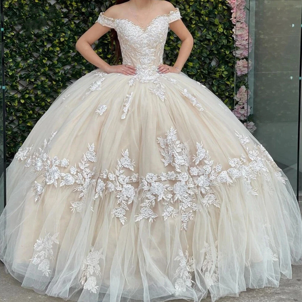 Off The Shoulder Quinceanera Dresses Champagne Lace Appliqued Beaded Party Gowns Ebay